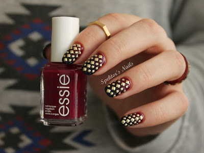 Today's design started out with a gradient and ended up with golden studs. I used three beautiful colors to create a gradient: Essie - Bahama Mama, Essie - Sole Mate and Sally Hansen - Night Watch. This already looked different from what I expected and I probably wouldn't really have needed three colors, but nonetheless I liked the result. I was waiting for the perfect opportunity to redo my fully covered studded nails from the Deadly Sins Challenge and this was it! With the golden round and square studs from Born Pretty Store I added the same pattern as before and finished with one coat of Essence - BTGN Top Sealer.