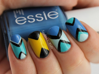 I realized today I'm really out of practice when it comes to to free-hand nail art. I painted this design with a nail art brush and I messed up some of the lines. Well, I need more practice! The colors were standing side by side on my desk, waiting to be stored again and I figured they would look good combined in a design. They're Essie - In The Cab-Ana, Avenue Maintain, China Glaze - For Audrey, Re-Fresh Mint and Anny - Sunshine In My Heart.  I used acrylic paint for the black lines. On Top is one coat of Essence - BTGN Top Sealer.